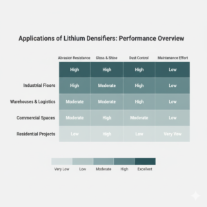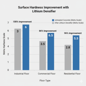 - Unlike surface coatings that peel or wear off, lithium densifiers chemically bond with the concrete, ensuring permanent improvement in abrasion resistance.